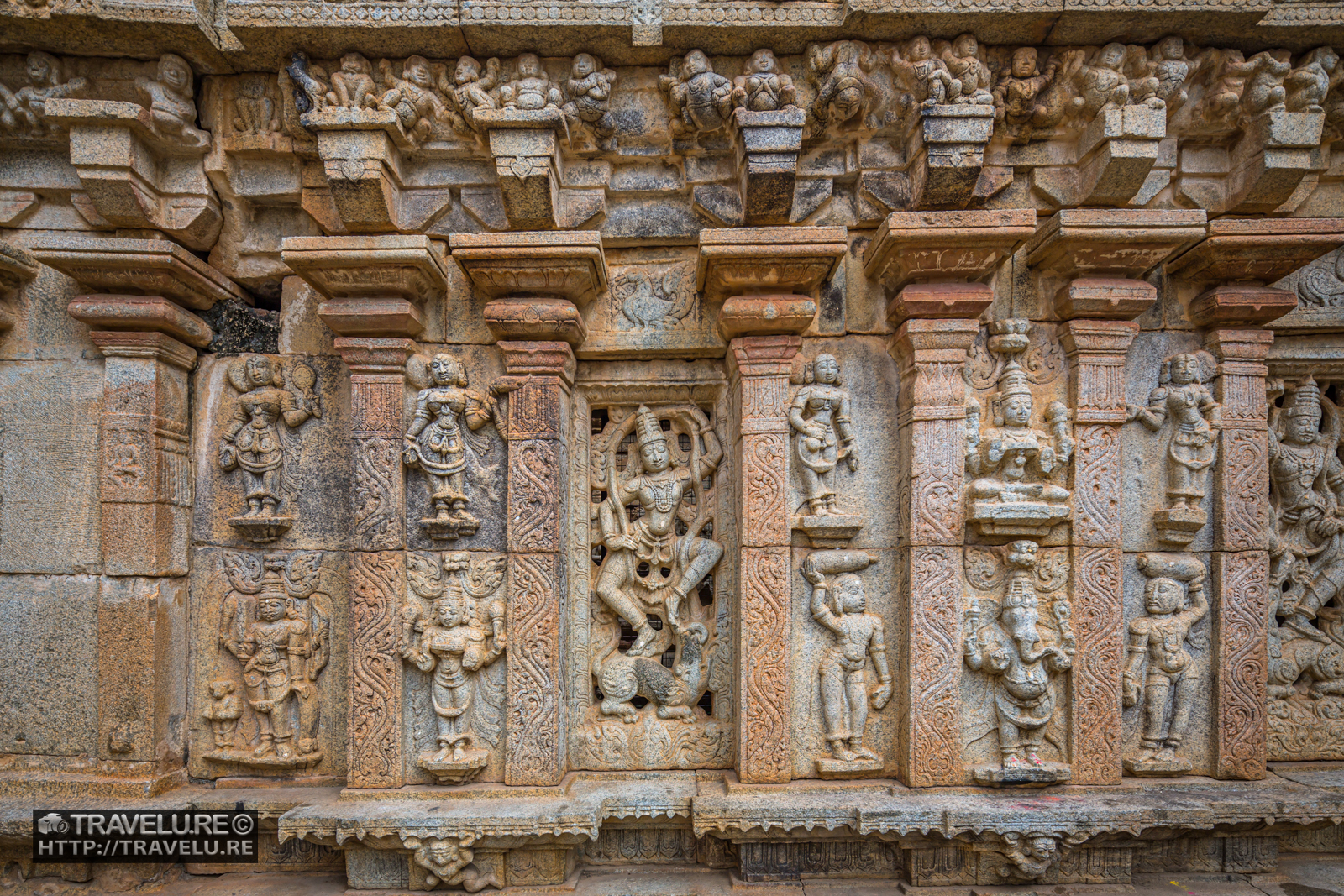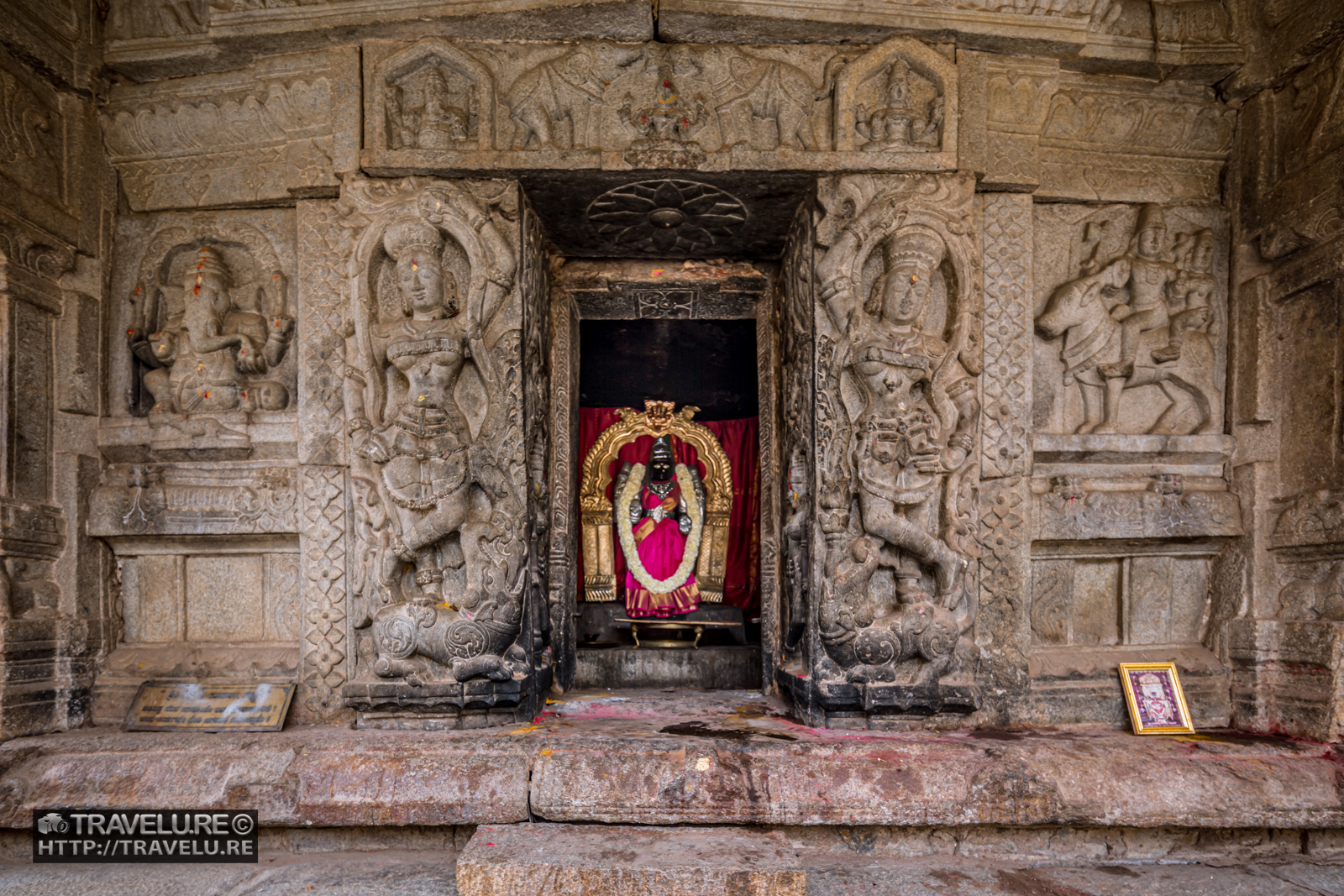 Between the two large shrines, there is a smaller Uma-Maheshwara shrine with a Kalyana Mandapam (marriage altar). Many ornate black stone pillars support this shrine. These pillars display bas reliefs of the Hindu gods Shiva and Parvati, Brahma and Saraswati, Vishnu and Lakshmi, Agni and Swaha, and plants and birds. While the architectural style is Dravidian, these reliefs are typical of Hoysalas.