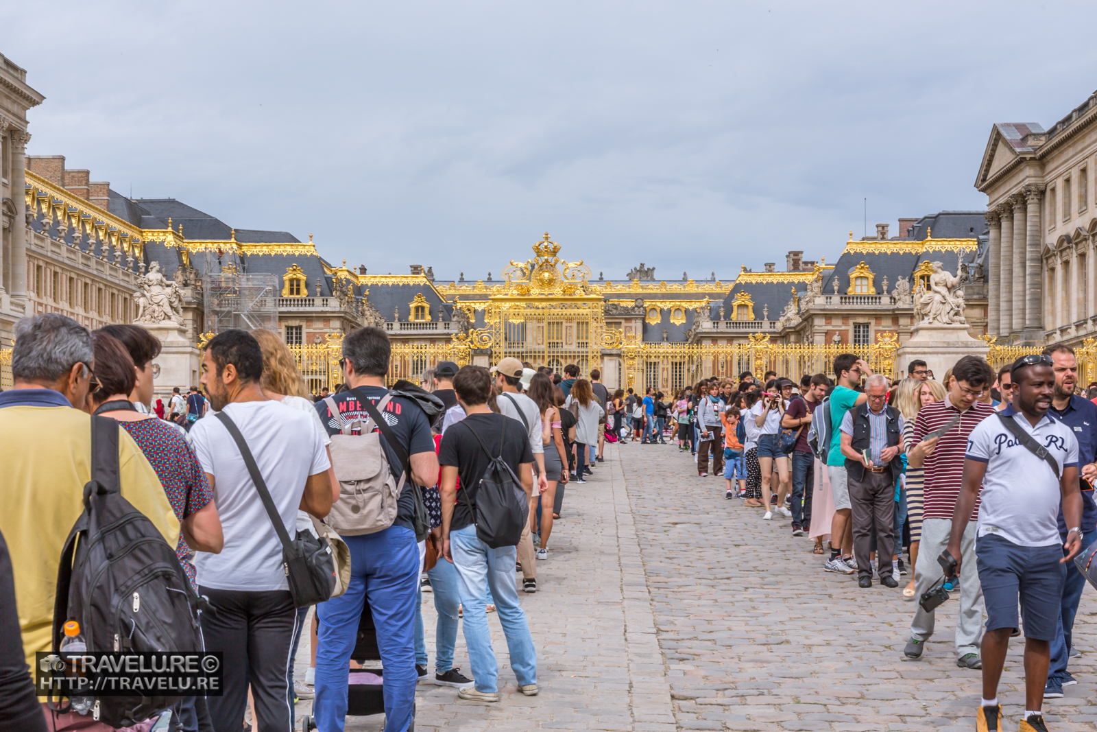 We had bought the tickets beforehand from our hotel’s concierge. Reaching Versailles-Rive Gauche in an RER C Yellow Line train, we took a short walk to Château de Versailles. And, we ran into this summertime sea of humanity at the Château’s entrance!