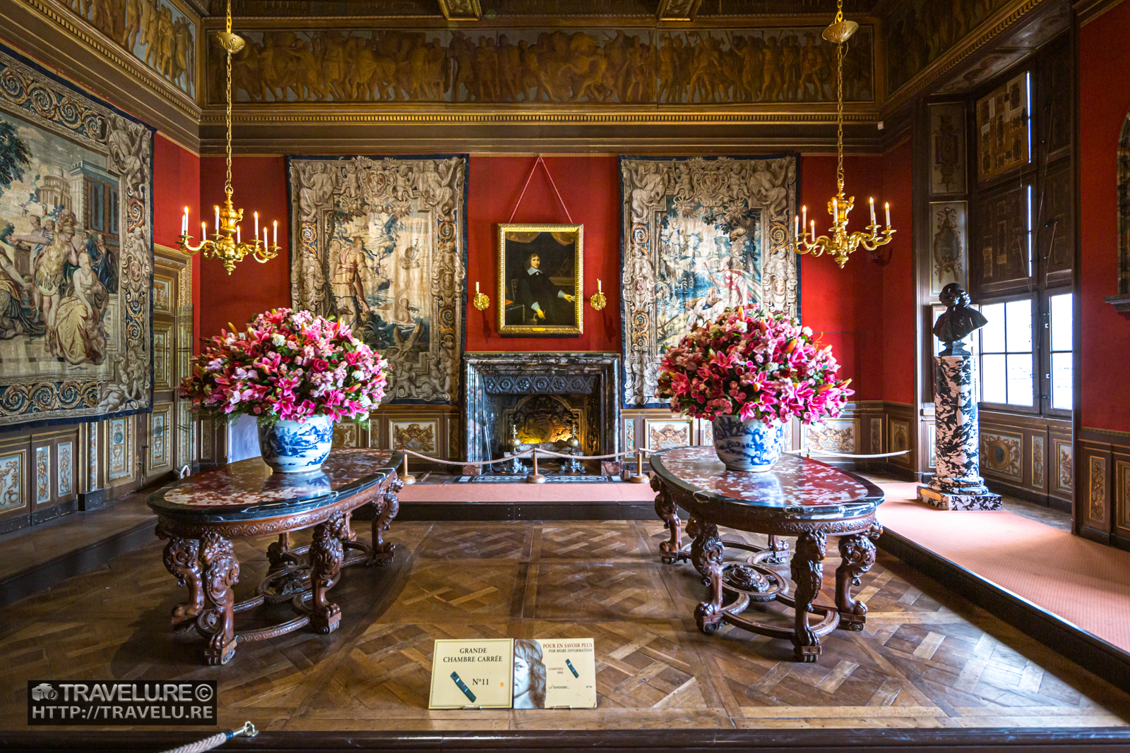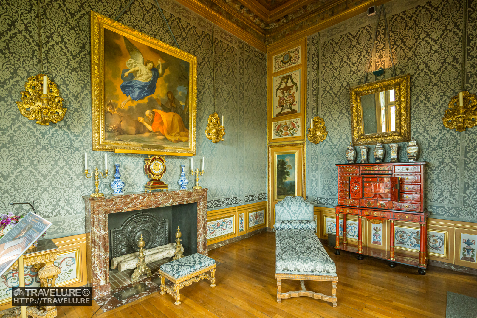 The set of three arches as you approach the vestibule from the entrance are aligned with the arches leading to the salon, and to the gardens. So, you can see the central axis of the garden even before entering the palace. The primary rooms are all on ground floor. That explains why there is no grand staircase, a standard feature for most chateaux of the time. Or maybe the absence of a grand staircase caused the main rooms to be placed on the ground floor.