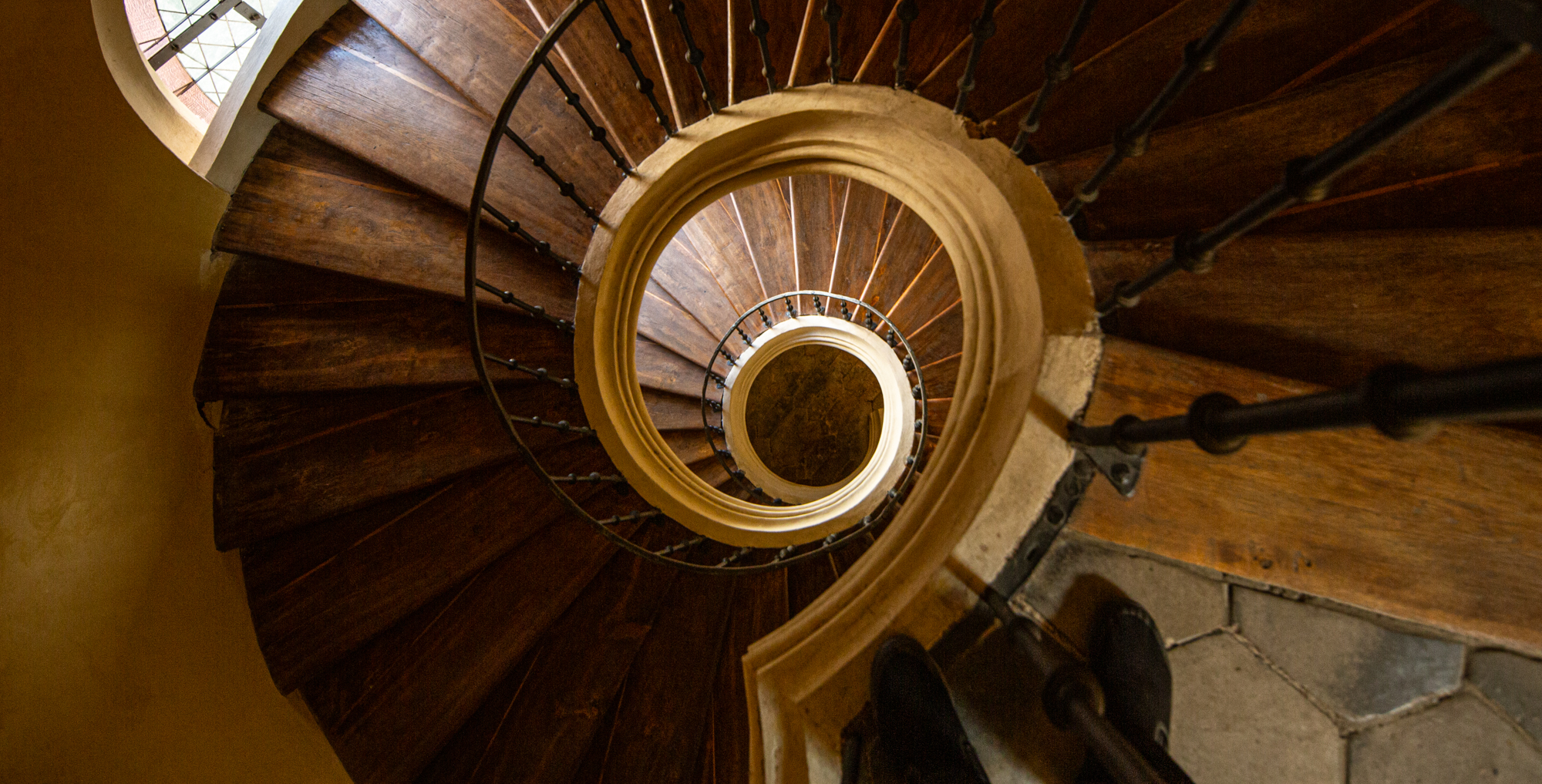 Spiral staircases are a fascinating subject to shoot. Their lighting, textures, and materials offer an opportunity to get creative with your images. The perspective as you look up from beneath differs from the one as you look down from the top. Its composition is the tricky part.
