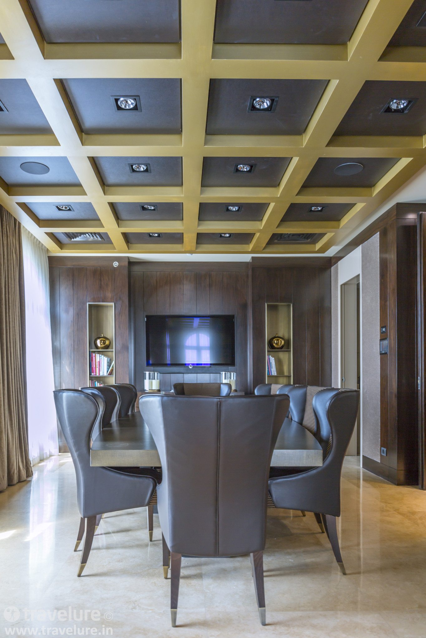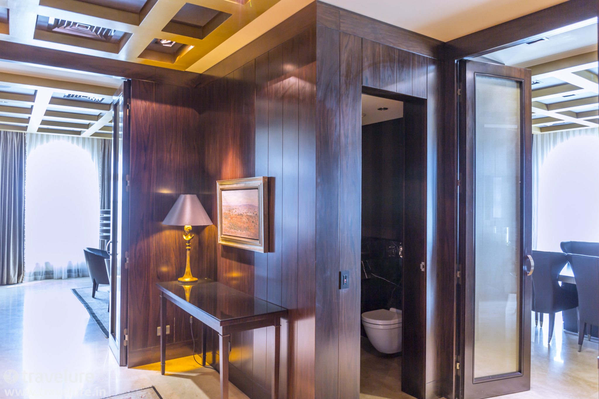 One of its entrance lobby passages leads you to the boardroom-cum-dining room, while the other takes you to the lounge-cum-living area. Right here is a guest powder room that may be accessed through this lobby. The living area comfortably seats 8. The suite has its dedicated nook for a treadmill and comes with a fully stocked bar.