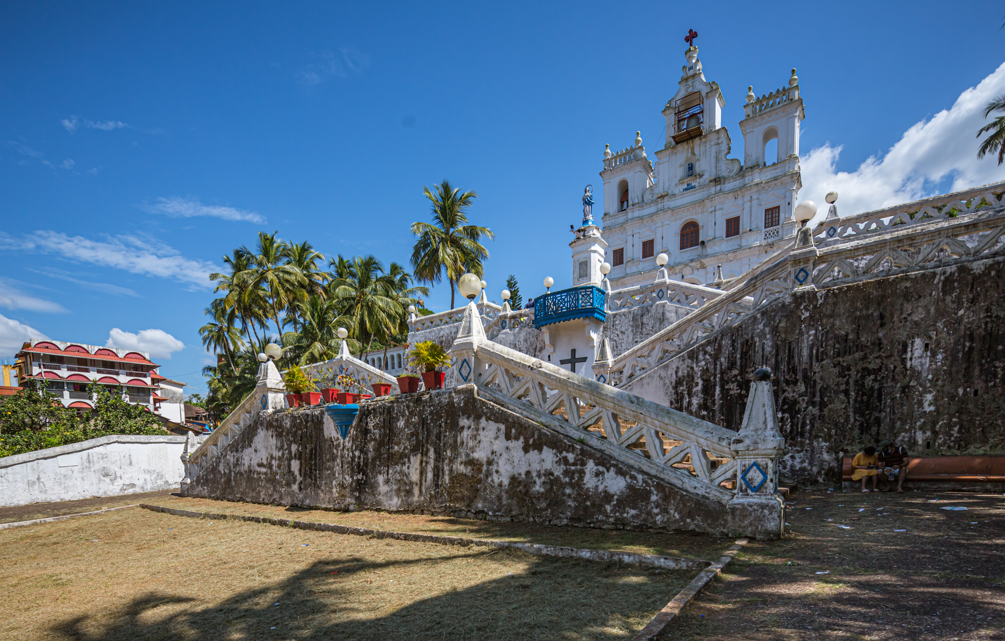 In Panjim, on the periphery of Fontainhas, lies Our Lady of Immaculate Conception Church. First built in 1541 and later replaced by a larger church in the 1600s, Our Lady of Immaculate Conception Church is a prominent landmark in Panjim. Since it sits atop a hill, for the convenience of devotees, they added a symmetrical zig zag staircase to it in the eighteenth century.