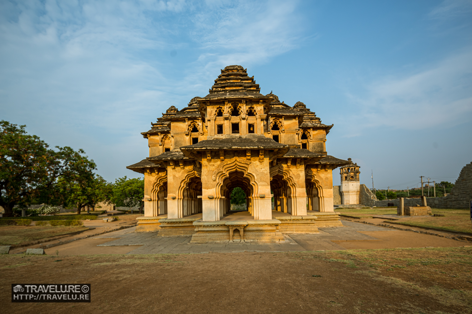 In the complex’s east is the Gajashala, or elephant stables. The structure comprises eleven chambers with arched openings. Domes top these chambers.