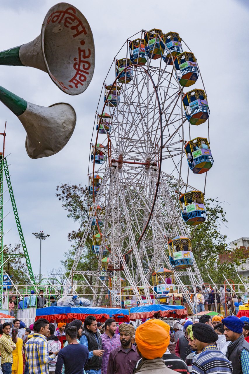After a quick lunch at camp, we made our way into town. The walk was a veritable photo-op at every step. Despite it being Holi, no one had messed with us and my camera gear was safe. During this walk, we realised that the parked vehicles were the campsites of the villagers who had poured into Anandpur Sahib for celebrations. The occupants of each vehicle had taken up a few hundred square feet of area around their vehicles and set up stables for horses, cattle and camels, kitchens for their meals, and tents for protection from the elements. The entire town had transformed into a makeshift fair ground.
