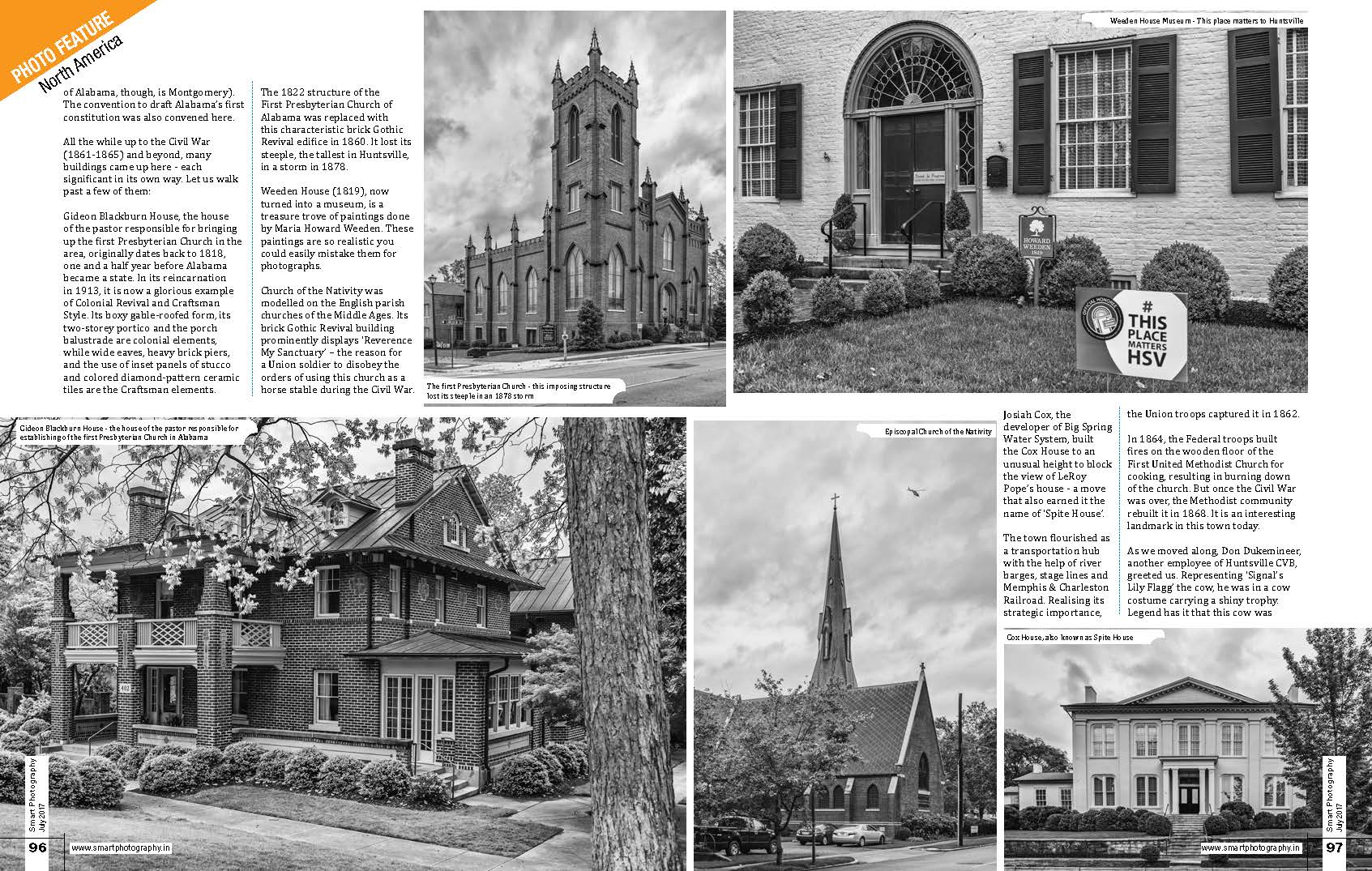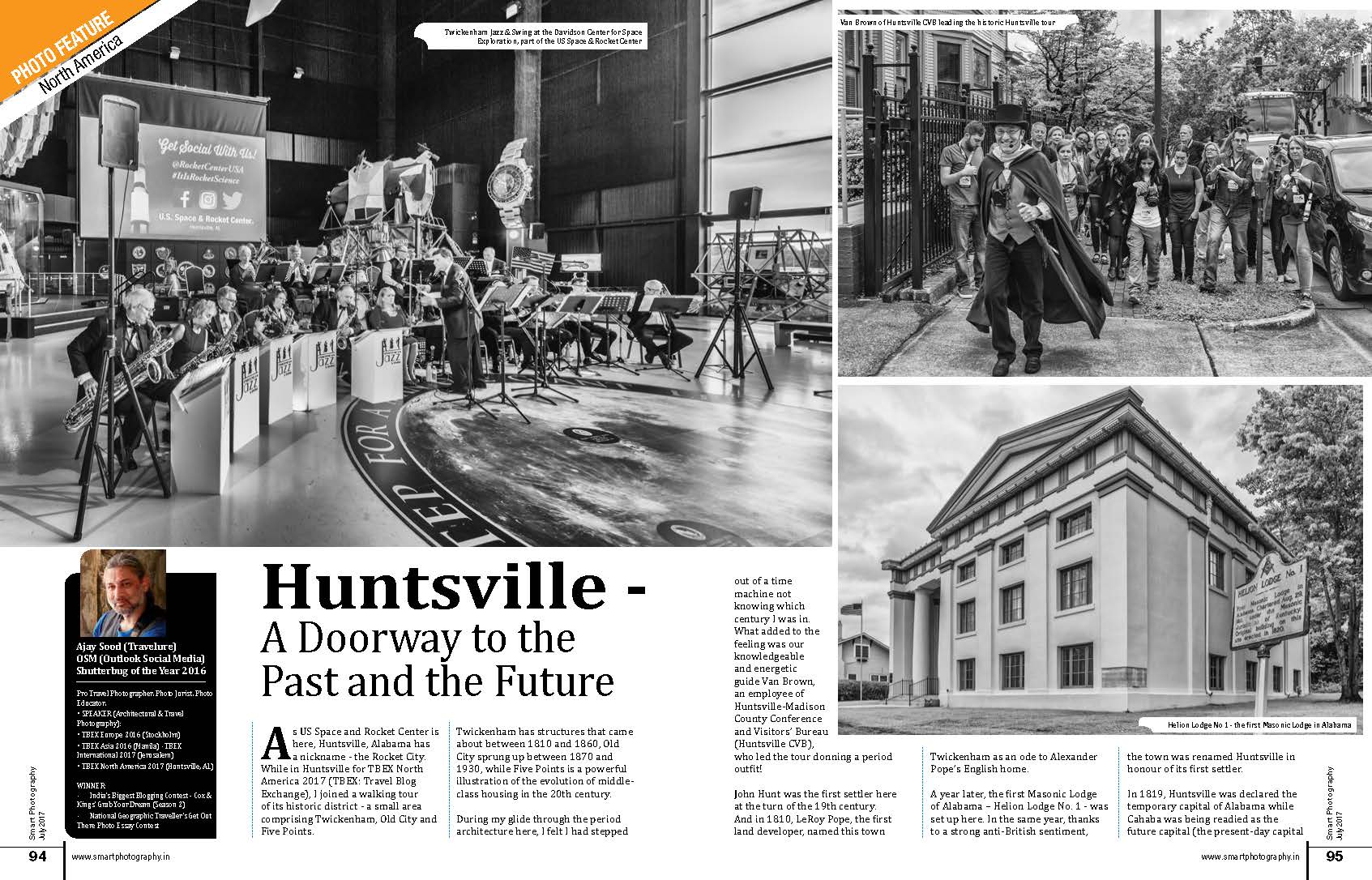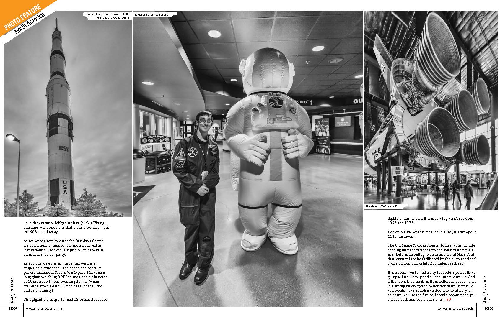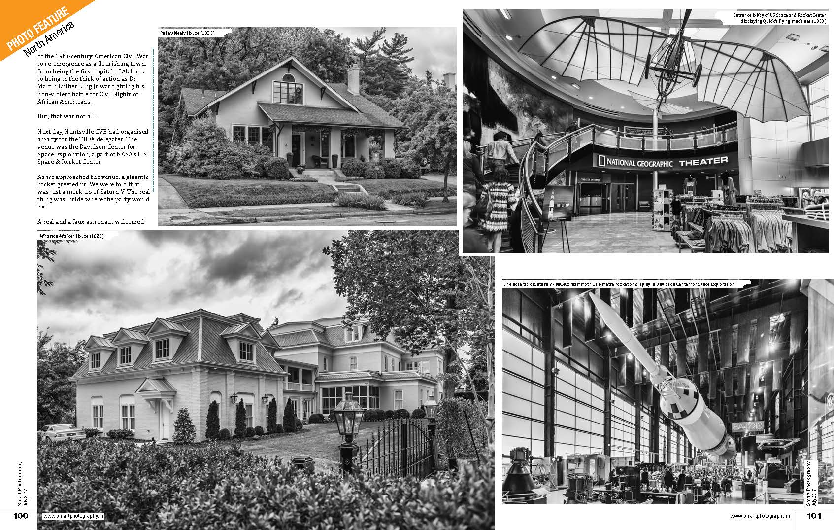 Smart Photography (India’s leading photography magazine) has carried my article (Huntsville – A Doorway to the Past and the Future) in their July 2017 Annual B&W Issue. That is why the images are in B&W.