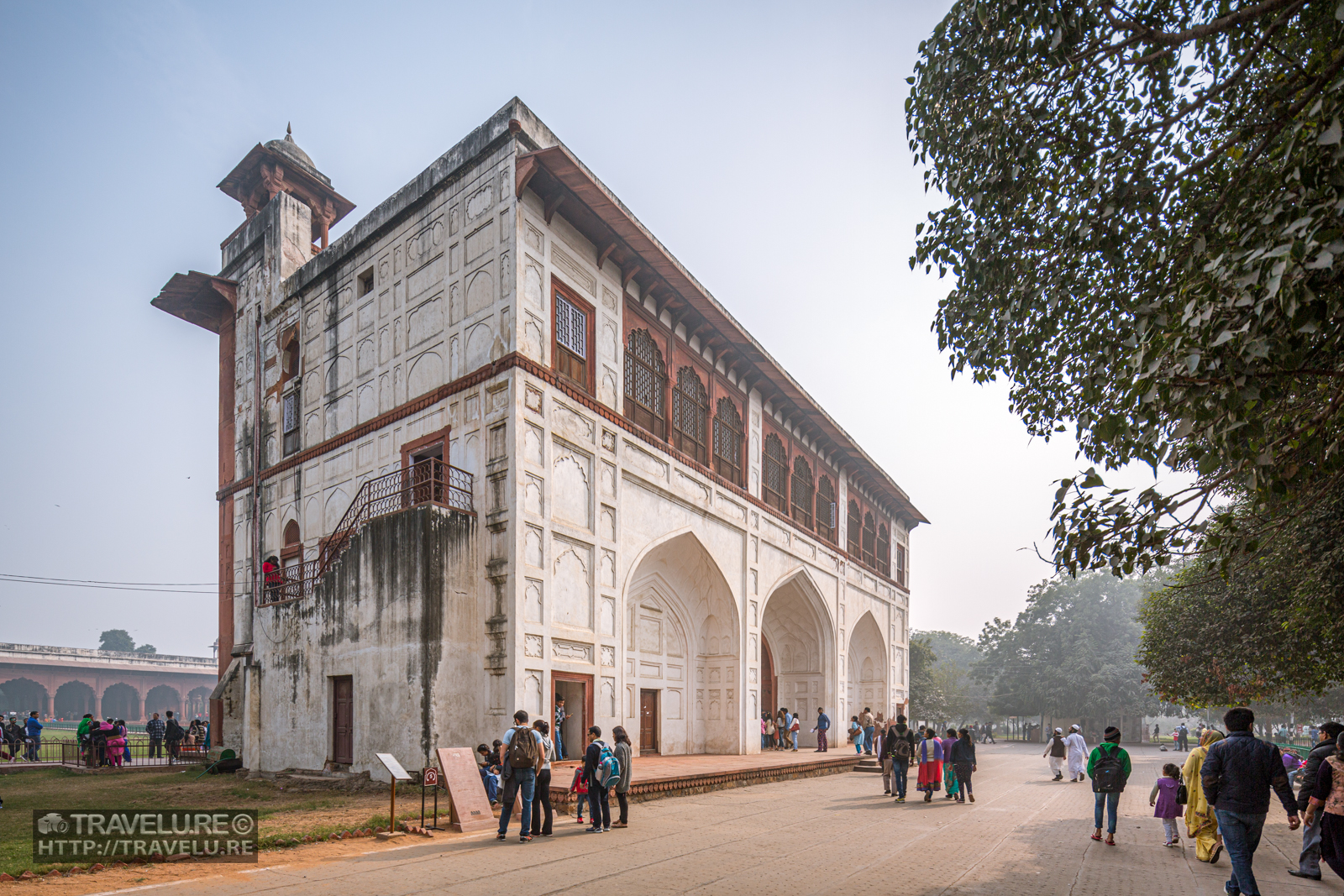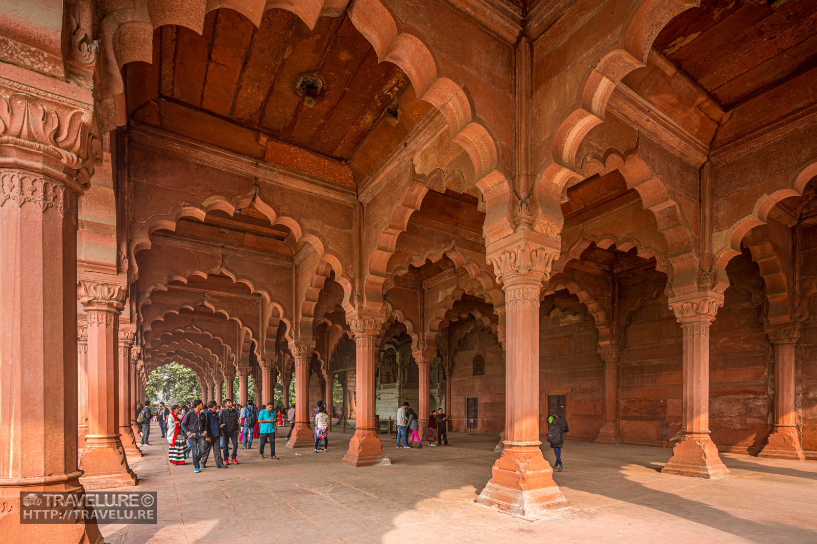 Though most of the structures are marble, one significant exception is Diwan-i-Aam. Made with rust-coloured sandstone, this 100×60 ft hall is open from three sides. A set of columns support the arches spanned by sandstone beams. These pillars divide the hall into 27 square bays. The emperor met his subjects and heard their grievance from a marble balcony in the eastern wall.