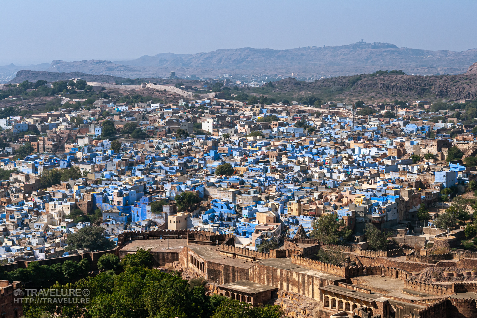 Mehrangarh Fort reminds me of a bad-guy Bollywood film. This bad-guy has headquarters on an island that rises from the sea at the flick of a button. The drama of a solid structure rising above the sea waters makes this island seem imposing. Mehrangarh also seems like an island that rose 400 feet from the plain below. The city beneath, like the waters in the sea, are all painted blue to honour a royal decree, giving Jodhpur the epithet of the blue city.