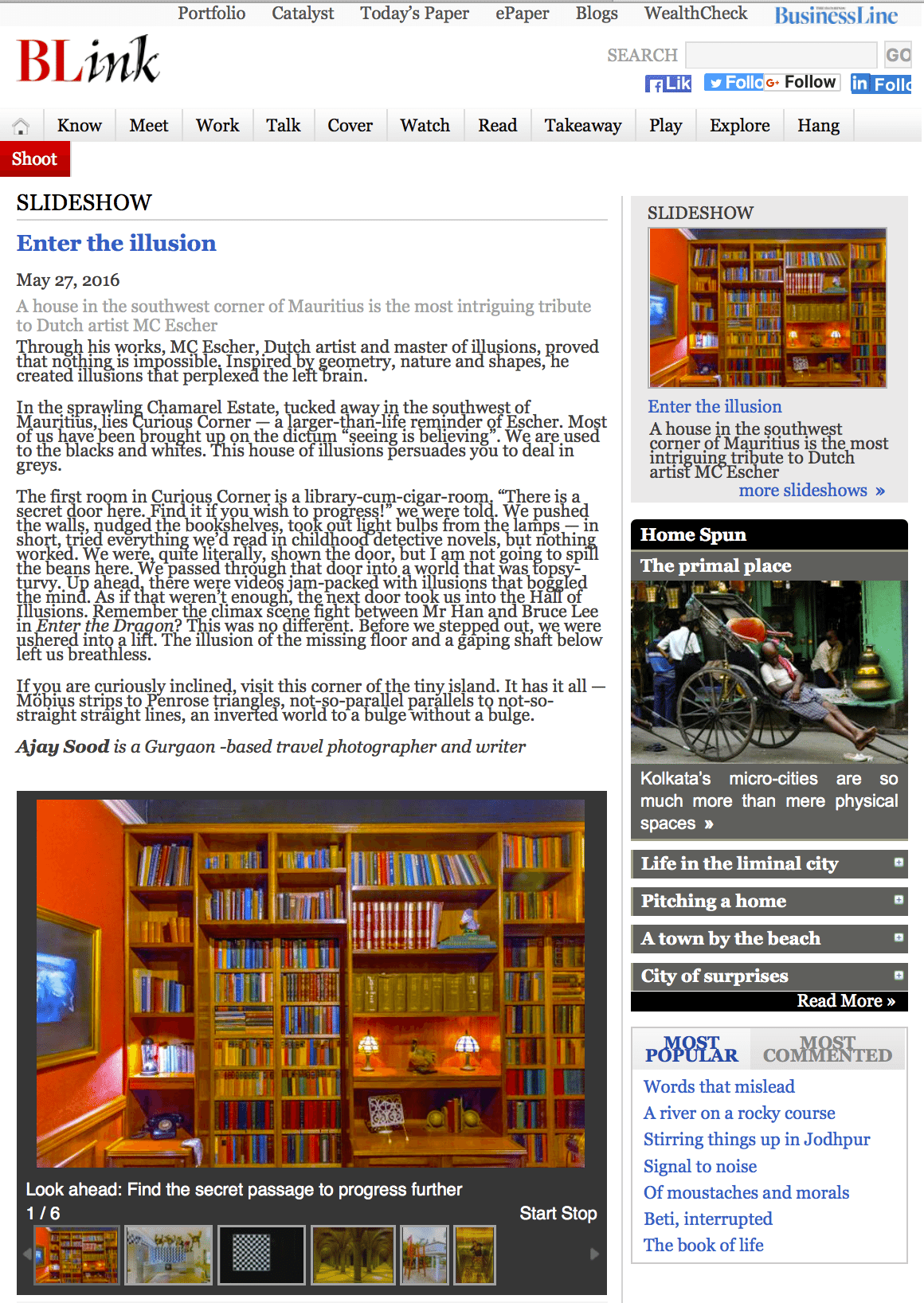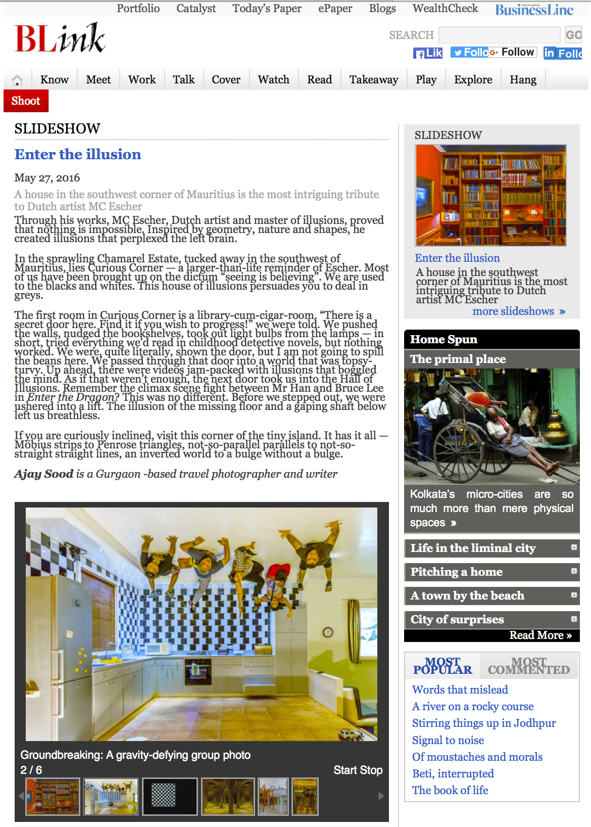 Recently, Mauritius Tourism had invited me to visit that Island nation. During this trip, I also visited Curious Corner, an illusion-filled abode in Southwest Mauritius. My account of this visit appeared in BLink – the weekend Magazine of The Hindu’s Business Line. The published article is reproduced below.