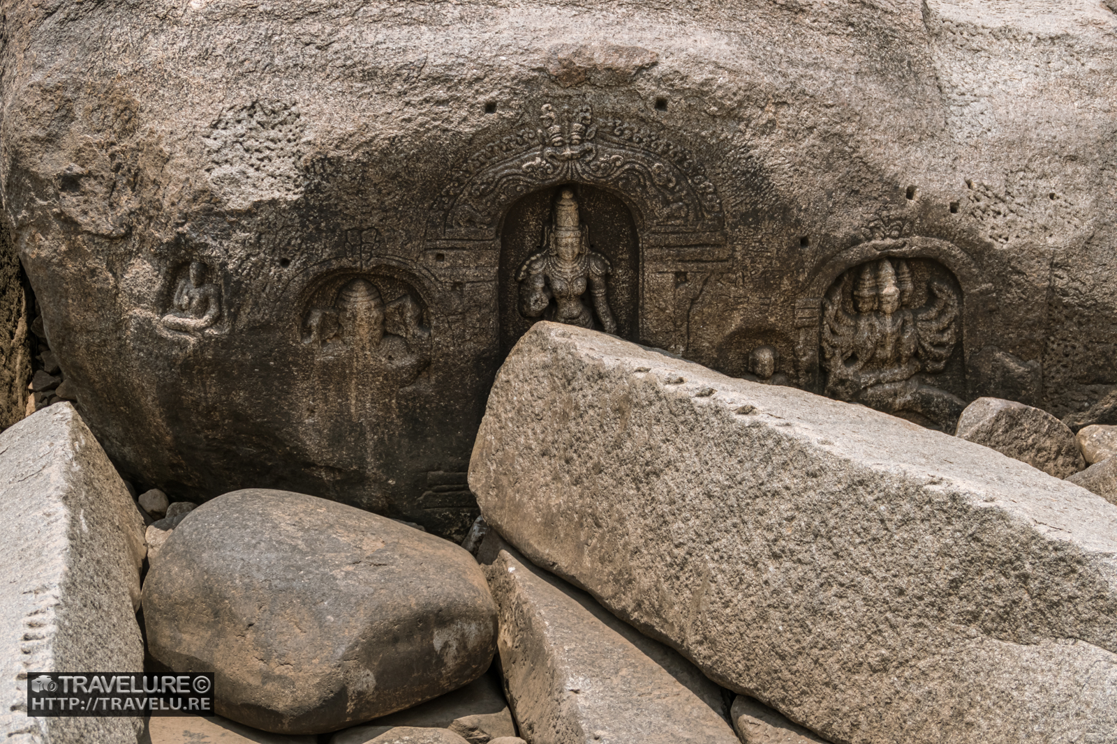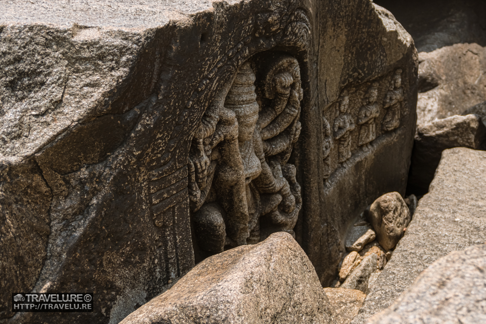 From here, we walked further north along the river and discovered shivalingas, idols, and inscriptions sprinkled across the stones and boulders, many of which get covered in Tungabhadra waters during the monsoons. These ranged from a single shivalinga with Nandi and devotees to sets of multiple shivalingas; inscriptions in ancient Kannada to idols of assorted gods and goddesses; carved stones, to prayer caves; and more.