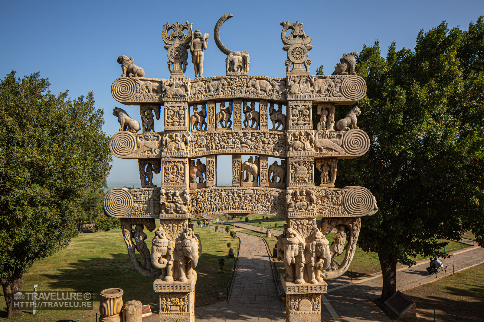 Faithfuls circumambulate the railing-enclosed circular pathway (Medhi) surrounding the stupa. A low wall (vedika) surrounds the entire structure. Torana (ceremonial gateway) punctuates this wall at four points. Torana is the crowning glory of Sanchi sculpture. Three architraves surmount the two posts topped by sculptured animals or dwarfs.