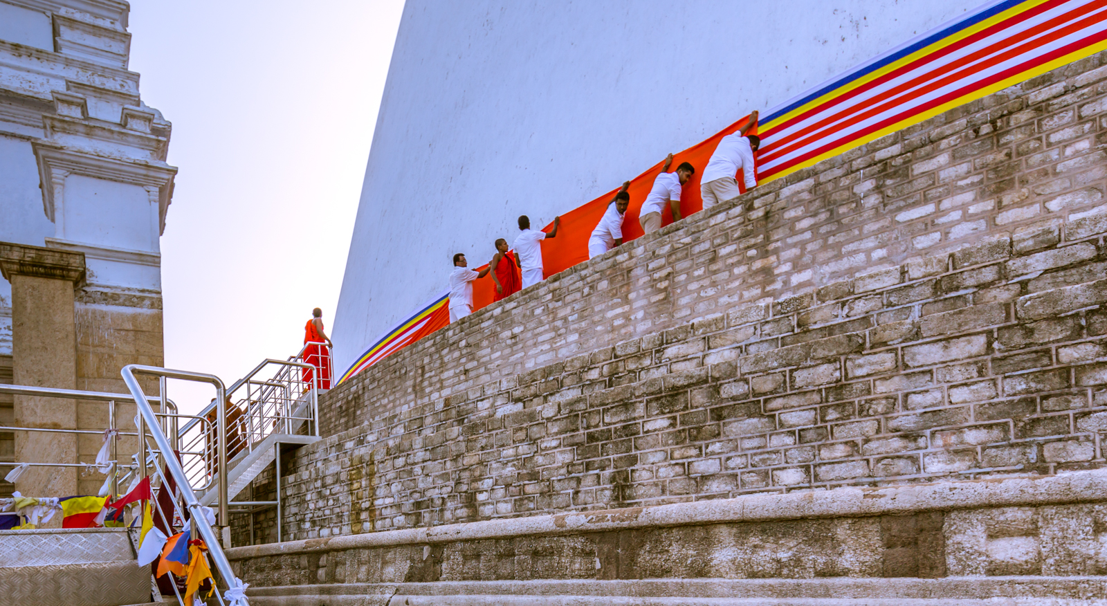 The largest Dagoba (Ruwanwelisaya) is 1100 feet in circumference. Here, dressing up Buddha happens 3-4 times a day as worshippers from far and wide bring 1100-feet long cloth and drape the Dagoba along its circumference. Since the belief is that Buddha’s relics are inside the Dagoba, this ritual symbolises treating the Dagoba as Buddha and dressing it as a Buddhist monk.