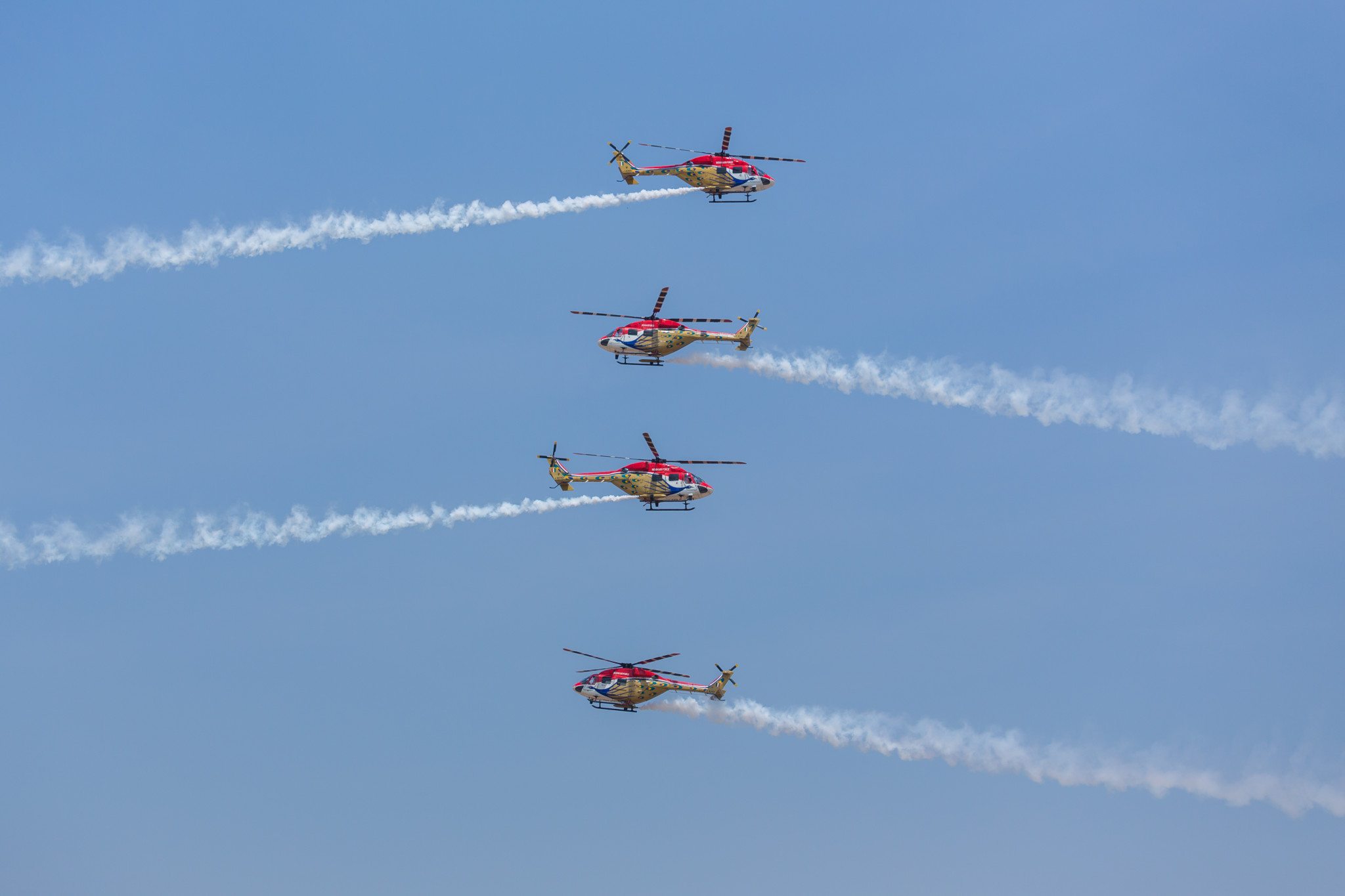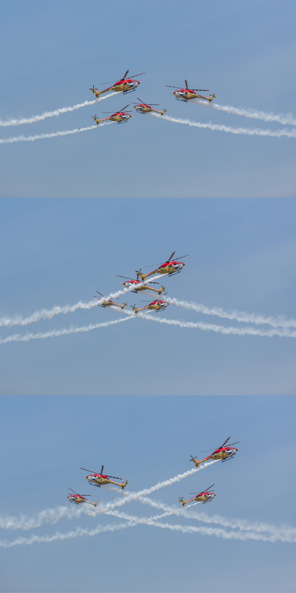 Sarang Aerobatics team (in HAL’s Advanced Light Helicopter Dhruv) took our breath away with their fearless aerobatics. They crisscrossed each other just a few feet apart and flew one on top of the other, while the audience’ hearts were in their mouths as their rotors seemed to be meshing into each other like gears.