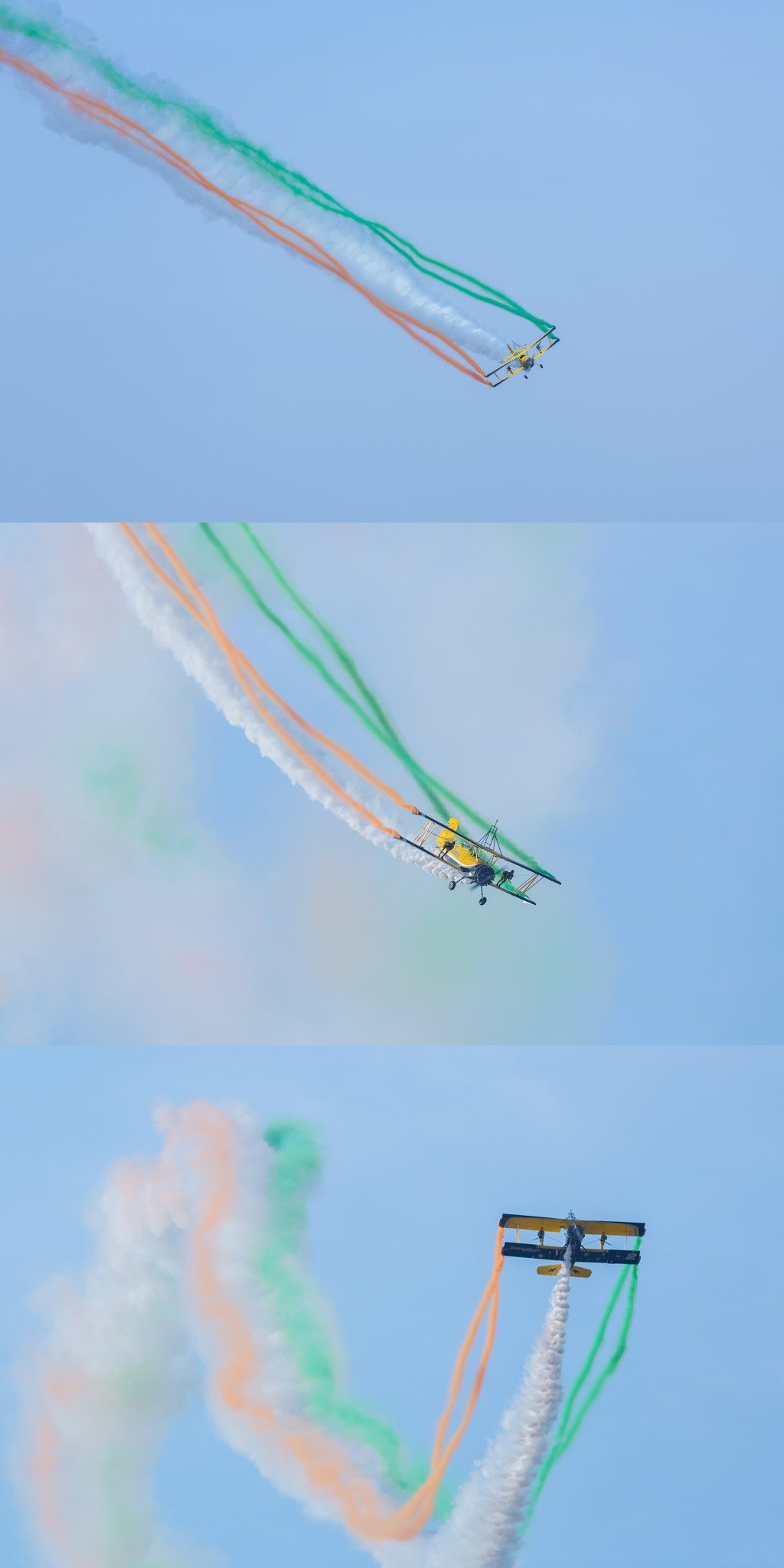 Breitling (UK) and Catwalk (Sweden) shared the honours of bringing a ‘first’ to India – both teams had a pair of wing walkers engaged in gutsy midair ramp… er… wing walks. Catwalk team stole a march over the Breitling team with their tricolour contrails display.