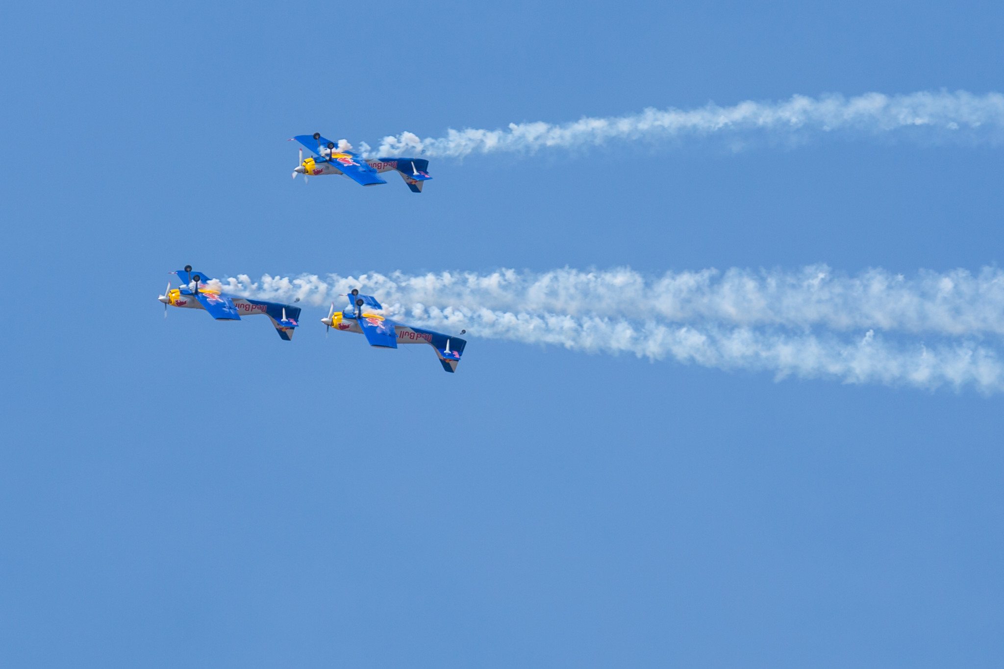 The most audacious aerobatic display was mounted by the Red Bull team flying Zlin Z-50 air-crafts from Czech Republic. Besides the upside-down manoeuvres, they were also flying extremely close. As a result, two red bulls crashed into each other midair, but the pilots managed to land the damaged birds safely, despite one plane suffering a major crack in its wing.